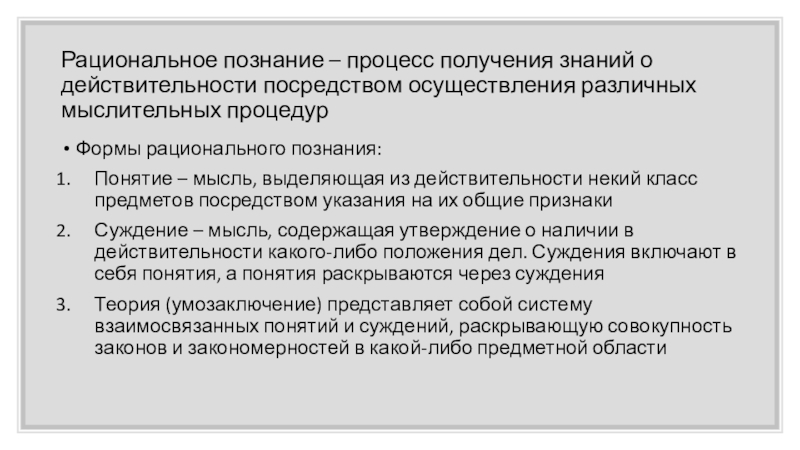 Слайд 23Рациональное познание – процесс получения знаний о действительности посредством осуществления различных