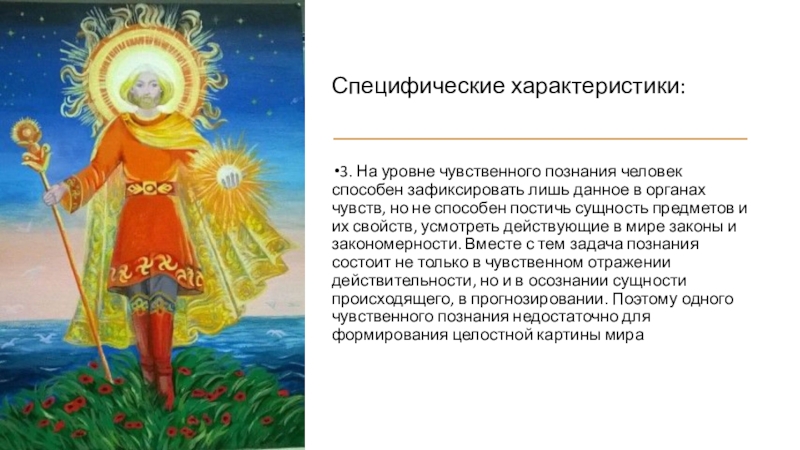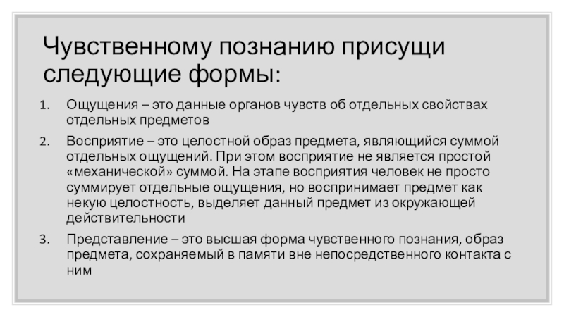 в органах чувств, но не способен постичь сущность предметов и их свойств, усмотреть действующие в мире законы и закономерности. Вместе с тем задача познания состоит не только в чувственном отражении действительности, но и в осознании сущности происходящего, в прогнозировании. Поэтому одного чувственного познания недостаточно для формирования целостной картины мира