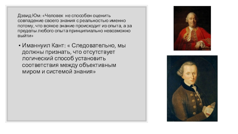 Слайд 12Дэвид Юм: «Человек не способен оценить совпадение своего знания с реальностью