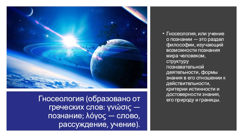 Слайд 15Гносеология (образовано от греческих слов: γνώσις — познание; λόγος — слово,