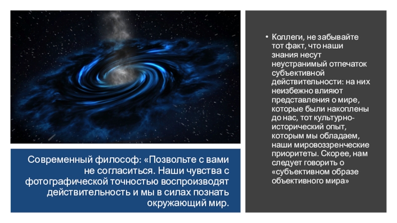 Коллеги, не забывайте тот факт, что наши знания несут неустранимый отпечаток субъективной действительности: на них неизбежно влияют представления о мире, которые были накоплены до нас, тот культурно-исторический опыт, которым мы обладаем, наши мировоззренческие приоритеты. Скорее, нам следует говорить о «субъективном образе объективного мира»