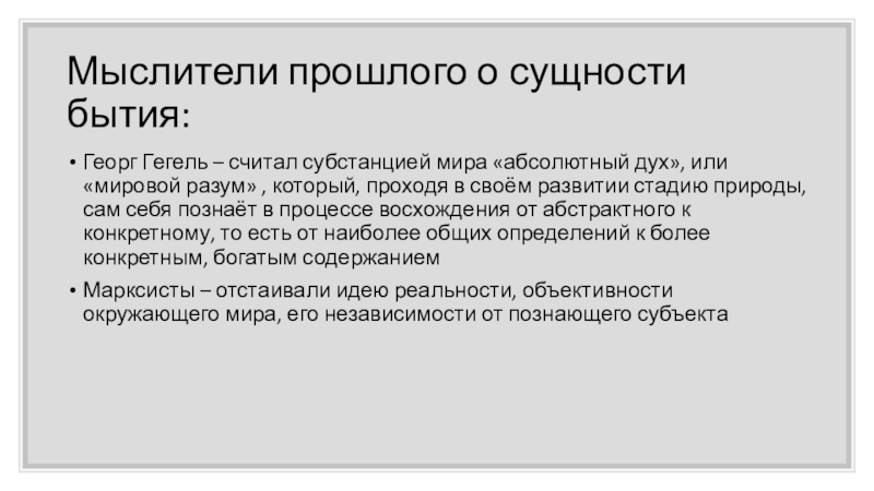 дух», или «мировой разум» , который, проходя в своём развитии стадию природы, сам себя познаёт в процессе восхождения от абстрактного к конкретному, то есть от наиболее общих определений к более конкретным, богатым содержанием