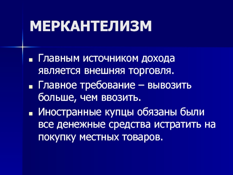 МЕРКАНТЕЛИЗМГлавным источником дохода является внешняя торговля.Главное требование – вывозить больше, чем ввозить.Иностранные купцы обязаны были все денежные