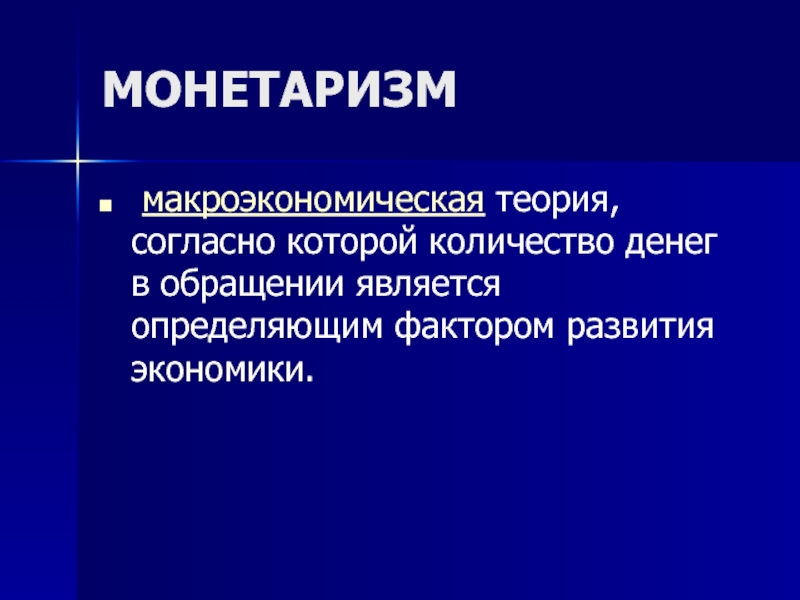 МОНЕТАРИЗМ макроэкономическая теория, согласно которой количество денег в обращении является определяющим фактором развития экономики.