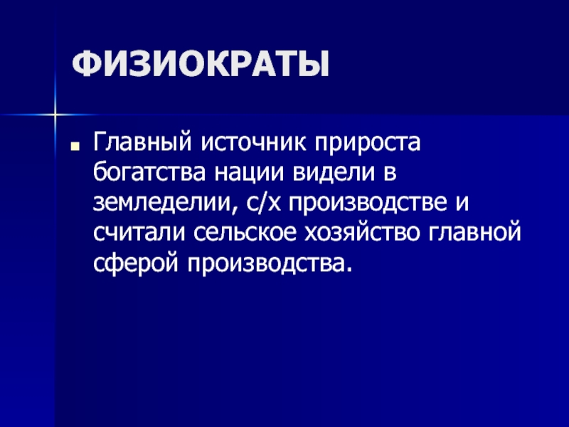 ФИЗИОКРАТЫГлавный источник прироста богатства нации видели в земледелии, с/х производстве и считали сельское хозяйство главной сферой производства.