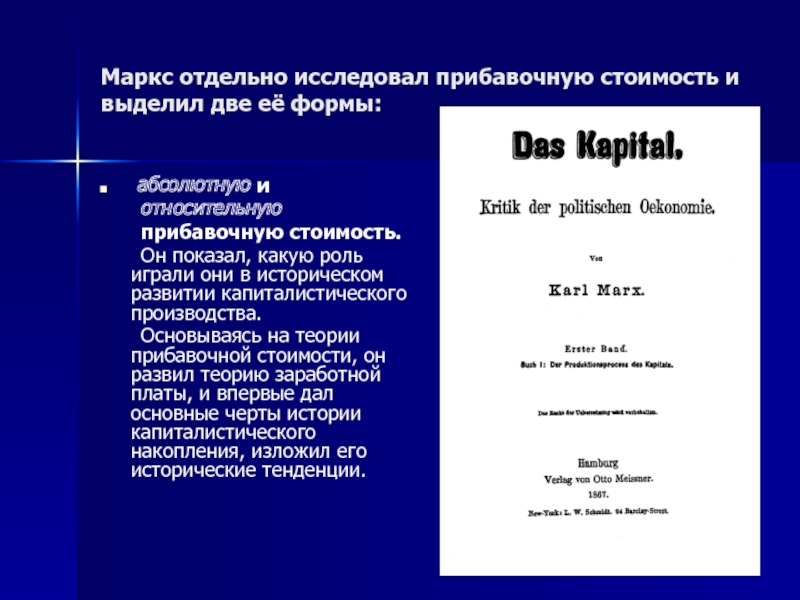 Маркс отдельно исследовал прибавочную стоимость и выделил две её формы: абсолютную и 	относительную 	прибавочную стоимость. 	Он показал, какую роль играли они