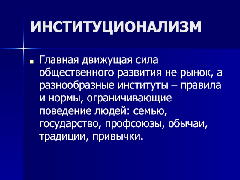 ИНСТИТУЦИОНАЛИЗМГлавная движущая сила общественного развития не рынок, а разнообразные институты – правила и нормы, ограничивающие поведение людей: