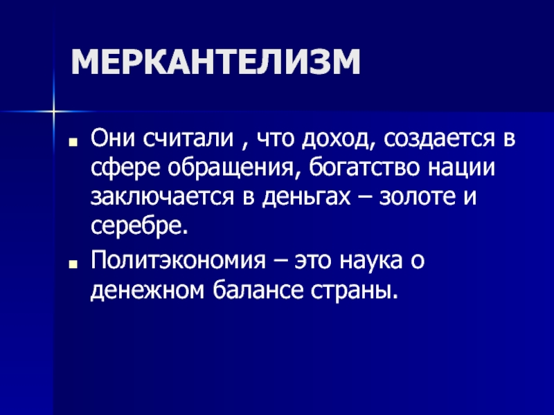 МЕРКАНТЕЛИЗМОни считали , что доход, создается в сфере обращения, богатство нации заключается в деньгах – золоте и