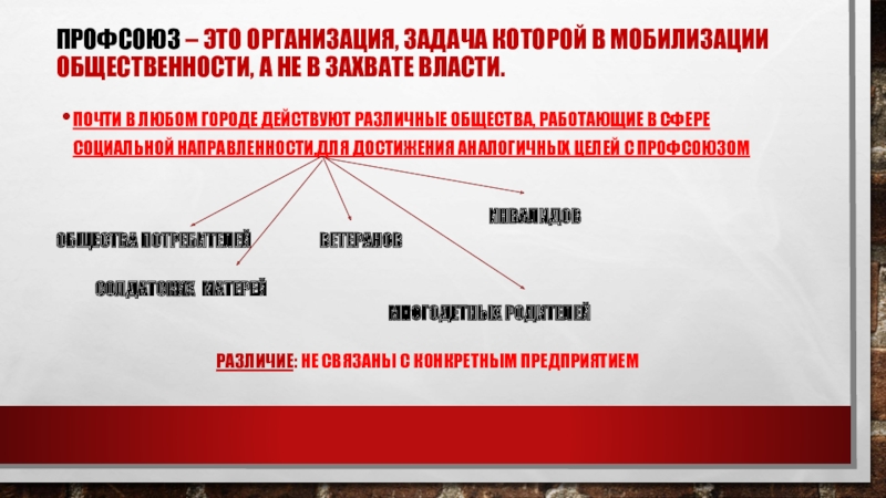 Почти в любом городе действуют различные общества, работающие в сфере социальной направленности,для достижения аналогичных целей с профсоюзом