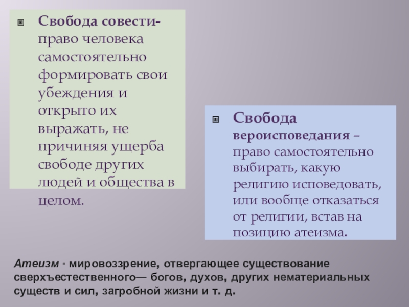 Свобода совести- право человека самостоятельно формировать свои убеждения и открыто их выражать, не причиняя ущерба свободе других людей и общества в целом.