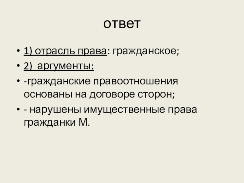 ответ1) отрасль права: гражданское;2) аргументы:-гражданские правоотношения основаны на договоре сторон;- нарушены имущественные права гражданки М.