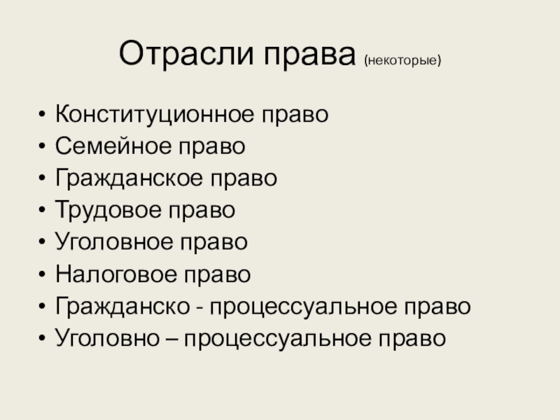 Отрасли права (некоторые)Конституционное правоСемейное правоГражданское правоТрудовое правоУголовное правоНалоговое правоГражданско - процессуальное правоУголовно – процессуальное право