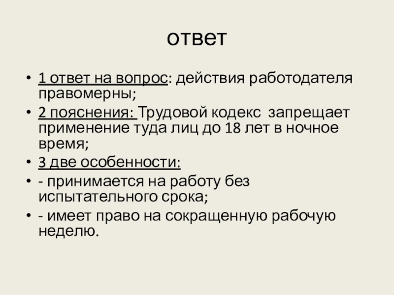 ответ1 ответ на вопрос: действия работодателя правомерны;2 пояснения: Трудовой кодекс запрещает применение туда лиц до 18 лет