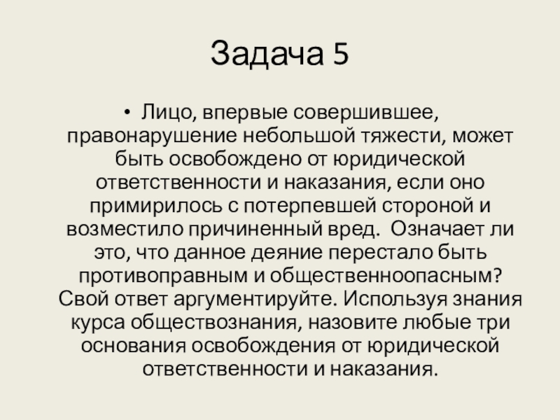 ответ1) данное деяние не перестало быть опасным;2) аргумент: Освобождение лица от юридической ответственности, не означает, что совершенное