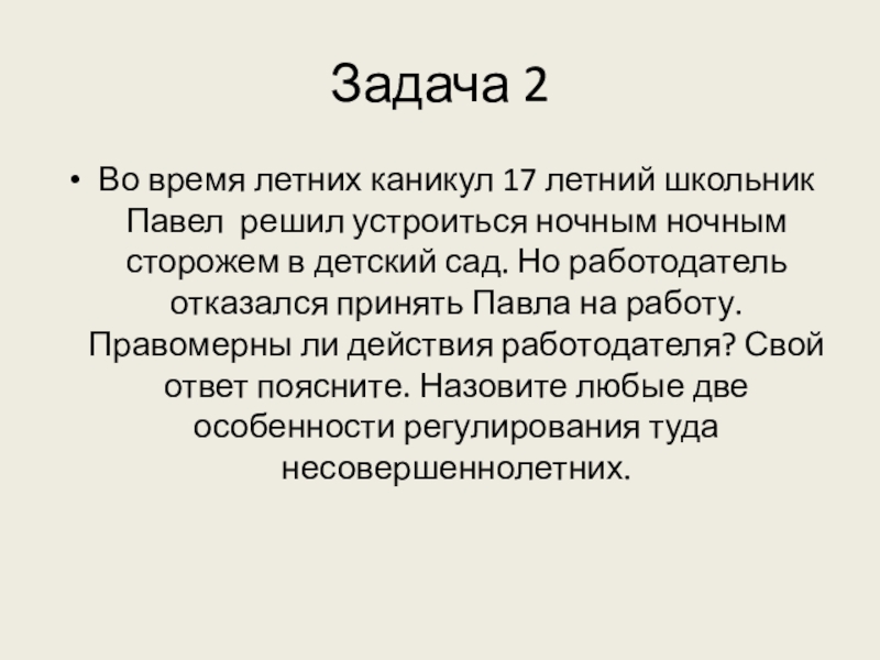 ночным ночным сторожем в детский сад. Но работодатель отказался принять Павла на работу. Правомерны ли действия работодателя? Свой ответ поясните. Назовите любые две особенности регулирования туда несовершеннолетних.