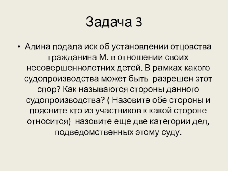 Задача 3Алина подала иск об установлении отцовства гражданина М. в отношении своих несовершеннолетних детей. В рамках какого