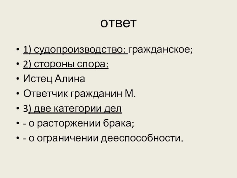 ответ1) судопроизводство: гражданское;2) стороны спора: Истец АлинаОтветчик гражданин М.3) две категории дел- о расторжении брака;- о ограничении