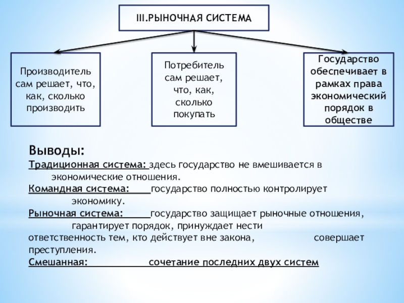Рыночная система: государство защищает рыночные отношения, гарантирует порядок, принуждает нести ответственность тем, кто действует вне закона, совершает преступления.