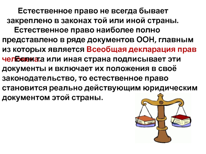 Естественное право наиболее полно представлено в ряде документов ООН, главным из которых является Всеобщая декларация прав человека.