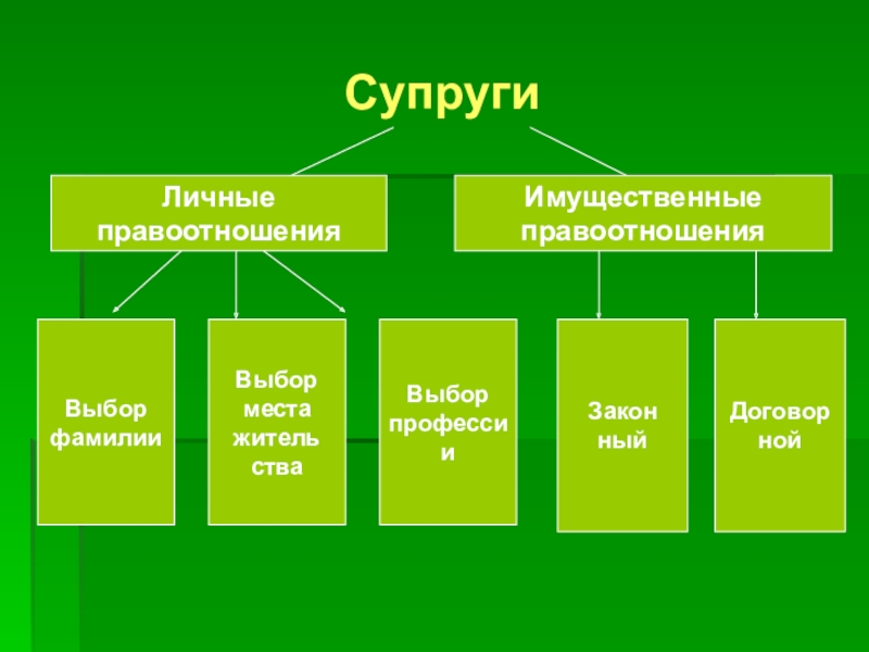 СупругиЛичные правоотношенияИмущественные правоотношенияВыбор фамилииВыборместажительстваВыбор профессииЗаконныйДоговорной