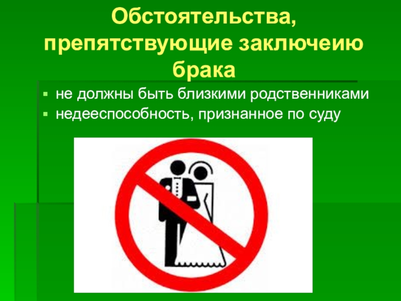 Слайд 9Обстоятельства, препятствующие заключеию брака