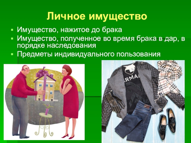 Личное имуществоИмущество, нажитое до бракаИмущество, полученное во время брака в дар, в порядке наследованияПредметы индивидуального пользования