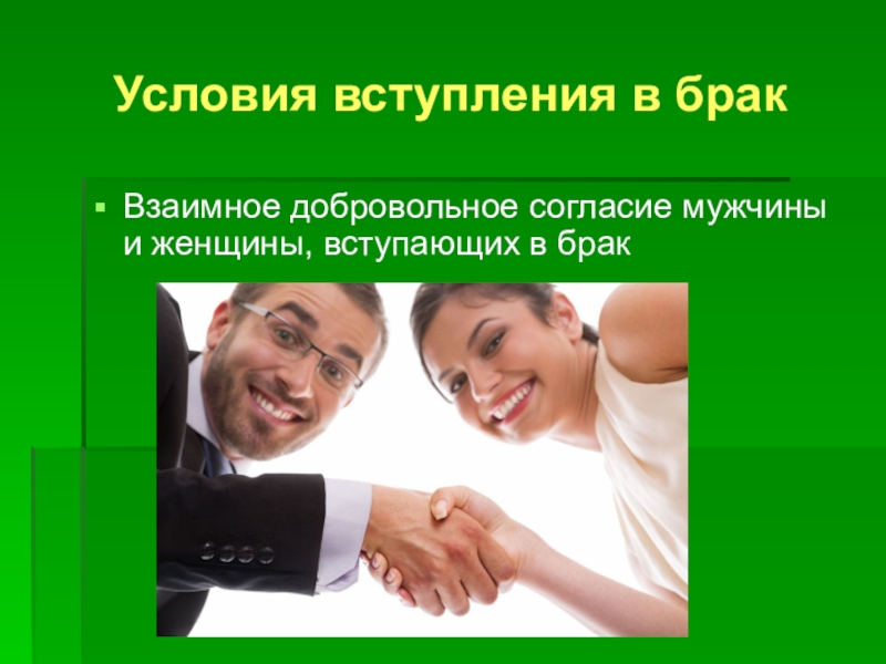 Условия вступления в бракВзаимное добровольное согласие мужчины и женщины, вступающих в брак
