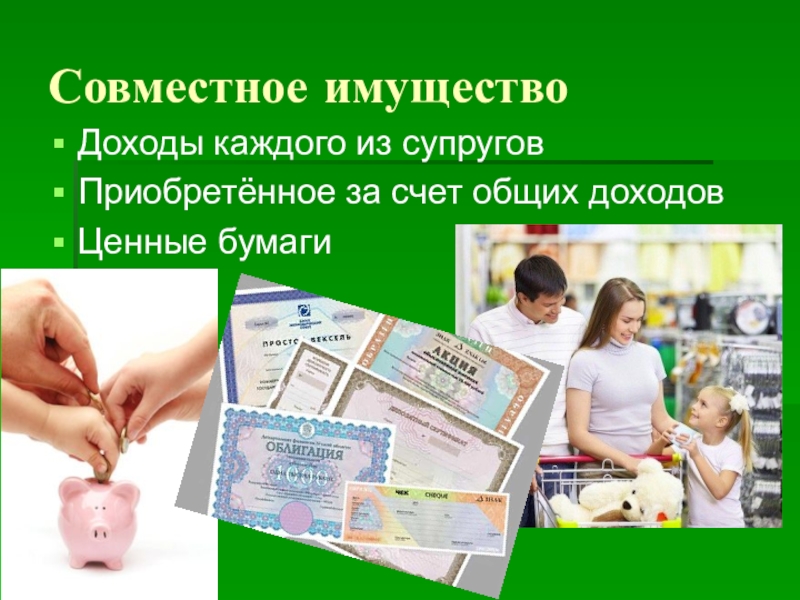 Совместное имуществоДоходы каждого из супруговПриобретённое за счет общих доходовЦенные бумаги
