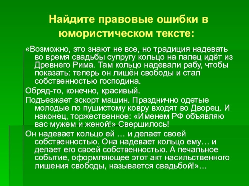 Найдите правовые ошибки в юмористическом тексте:«Возможно, это знают не все, но традиция надевать во время свадьбы