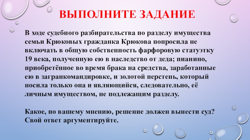 Крюкова попросила не включать в общую собственность фарфоровую статуэтку 19 века, полученную ею в наследство от деда; пианино, приобретённое во время брака на средства, заработанные ею в загранкомандировке, и золотой перстень, который носила только она и являющийся, следовательно, её личным имуществом, не подлежащим разделу.