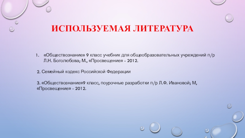 3. «Обществознание»9 класс, поурочные разработки п/р Л.Ф. Ивановой; М, «Просвещение» - 2012.