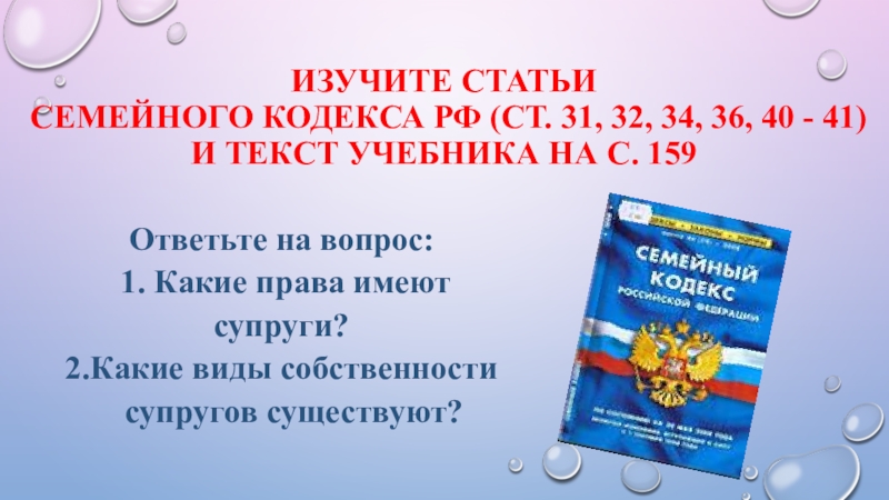 рФ (ст. 31, 32, 34, 36, 40 - 41) и текст учебника на с. 159