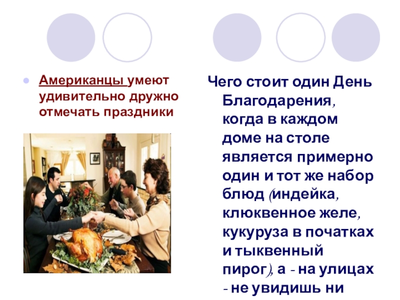 в каждом доме на столе является примерно один и тот же набор блюд (индейка, клюквенное желе, кукуруза в початках и тыквенный пирог), а - на улицах - не увидишь ни души.