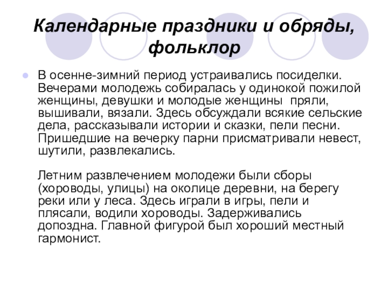 В осенне-зимний период устраивались посиделки. Вечерами молодежь