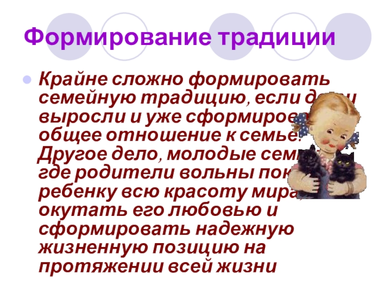 семейную традицию, если дети выросли и уже сформировали общее отношение к семье. Другое дело, молодые семьи, где родители вольны показать ребенку всю красоту мира, окутать его любовью и сформировать надежную жизненную позицию на протяжении всей жизни