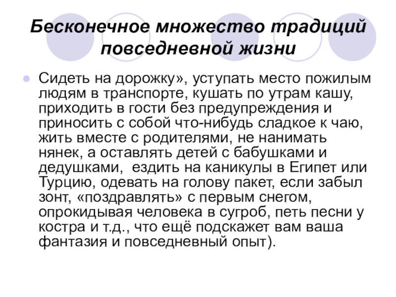 людям в транспорте, кушать по утрам кашу, приходить в гости без предупреждения и приносить с собой что-нибудь сладкое к чаю, жить вместе с родителями, не нанимать нянек, а оставлять детей с бабушками и дедушками, ездить на каникулы в Египет или Турцию, одевать на голову пакет, если забыл зонт, «поздравлять» с первым снегом, опрокидывая человека в сугроб, петь песни у костра и т.д., что ещё подскажет вам ваша фантазия и повседневный опыт).