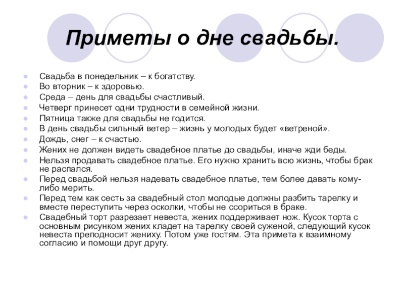 Слайд 27Приметы о дне свадьбы.