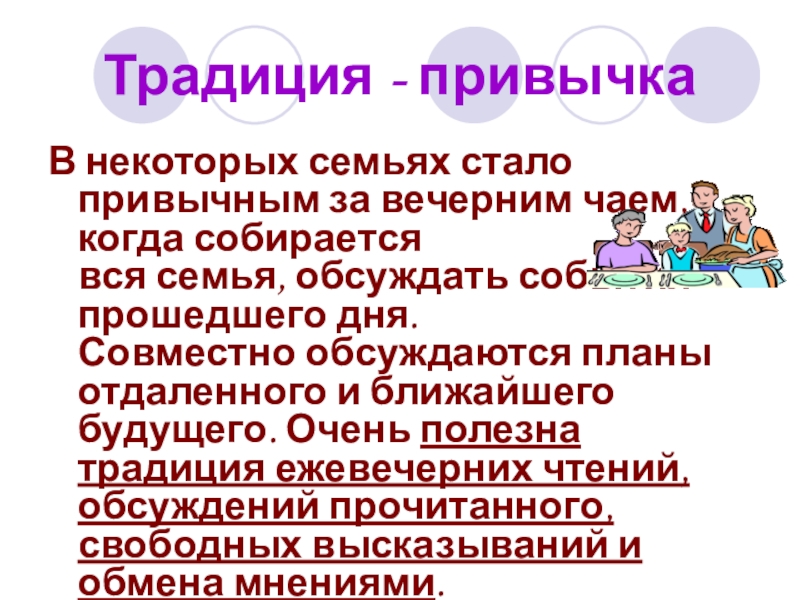 собирается вся семья, обсуждать события прошедшего дня. Совместно обсуждаются планы отдаленного и ближайшего будущего. Очень полезна традиция ежевечерних чтений, обсуждений прочитанного, свободных высказываний и обмена мнениями.