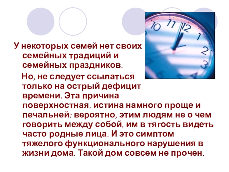 Но, не следует ссылаться только на острый дефицит времени. Эта причина поверхностная, истина намного проще и печальней: вероятно, этим людям не о чем говорить между собой, им в тягость видеть часто родные лица. И это симптом тяжелого функционального нарушения в жизни дома. Такой дом совсем не прочен.