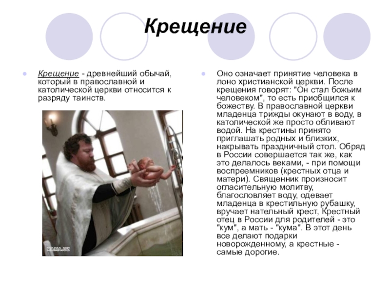 Оно означает принятие человека в лоно христианской церкви. После крещения говорят: "Он стал божьим человеком", то есть приобщился к божеству. В православной церкви младенца трижды окунают в воду, в католической же просто обливают водой. На крестины принято приглашать родных и близких, накрывать праздничный стол. Обряд в России совершается так же, как это делалось веками, - при помощи воспреемников (крестных отца и матери). Священник произносит огласительную молитву, благословляет воду, одевает младенца в крестильную рубашку, вручает нательный крест, Крестный отец в России для родителей - это "кум", а мать - "кума". В этот день все делают подарки новорожденному, а крестные - самые дорогие.
