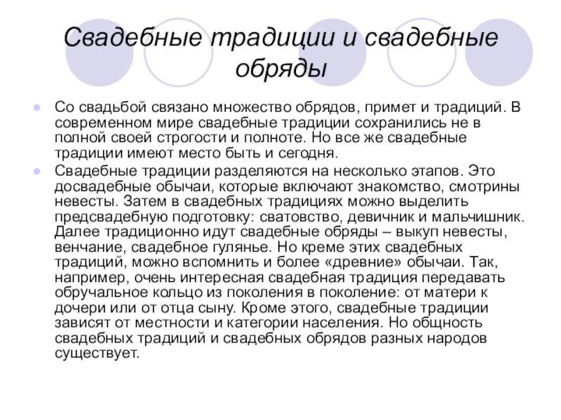 и традиций. В современном мире свадебные традиции сохранились не в полной своей строгости и полноте. Но все же свадебные традиции имеют место быть и сегодня.