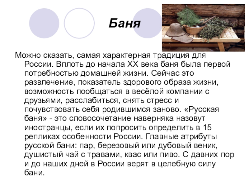 XX века баня была первой потребностью домашней жизни. Сейчас это развлечение, показатель здорового образа жизни, возможность пообщаться в весёлой компании с друзьями, расслабиться, снять стресс и почувствовать себя родившимся заново. «Русская баня» - это словосочетание наверняка назовут иностранцы, если их попросить определить в 15 репликах особенности России. Главные атрибуты русской бани: пар, березовый или дубовый веник, душистый чай с травами, квас или пиво. С давних пор и до наших дней в России верят в целебную силу бани.