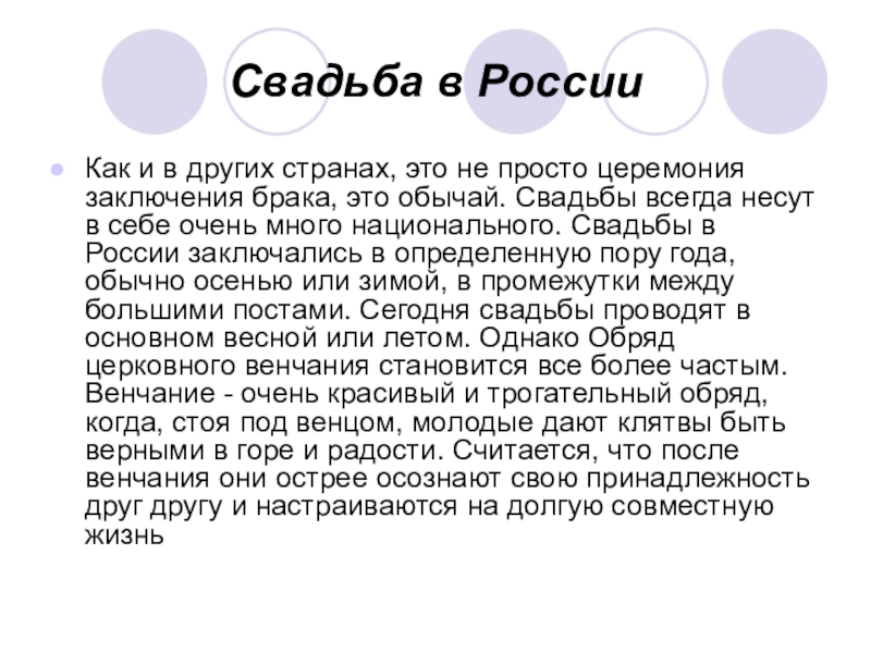 церемония заключения брака, это обычай. Свадьбы всегда несут в себе очень много национального. Свадьбы в России заключались в определенную пору года, обычно осенью или зимой, в промежутки между большими постами. Сегодня свадьбы проводят в основном весной или летом. Однако Обряд церковного венчания становится все более частым. Венчание - очень красивый и трогательный обряд, когда, стоя под венцом, молодые дают клятвы быть верными в горе и радости. Считается, что после венчания они острее осознают свою принадлежность друг другу и настраиваются на долгую совместную жизнь