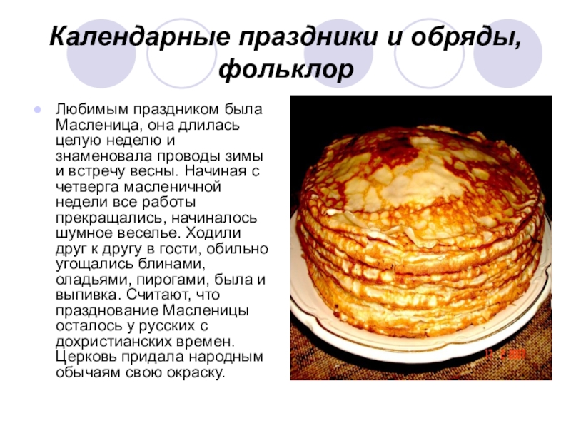 неделю и знаменовала проводы зимы и встречу весны. Начиная с четверга масленичной недели все работы прекращались, начиналось шумное веселье. Ходили друг к другу в гости, обильно угощались блинами, оладьями, пирогами, была и выпивка. Считают, что празднование Масленицы осталось у русских с дохристианских времен. Церковь придала народным обычаям свою окраску.