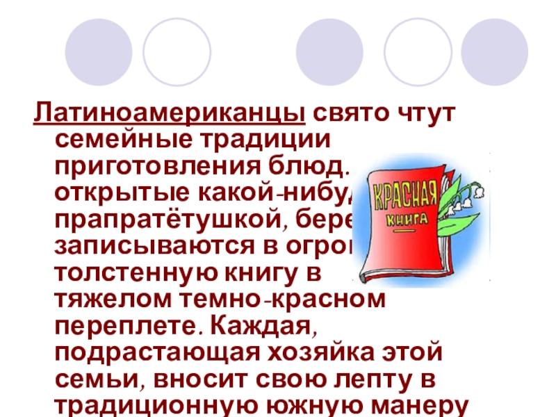 Слайд 18Латиноамериканцы свято чтут семейные традиции приготовления блюд. Рецепты, открытые какой-нибудь