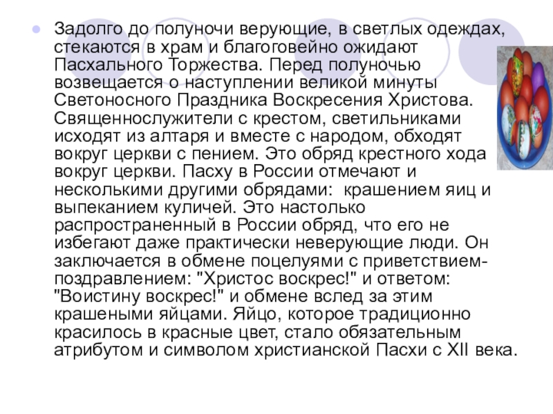 благоговейно ожидают Пасхального Торжества. Перед полуночью возвещается о наступлении великой минуты Светоносного Праздника Воскресения Христова. Священнослужители с крестом, светильниками исходят из алтаря и вместе с народом, обходят вокруг церкви с пением. Это обряд крестного хода вокруг церкви. Пасху в России отмечают и несколькими другими обрядами: крашением яиц и выпеканием куличей. Это настолько распространенный в России обряд, что его не избегают даже практически неверующие люди. Он заключается в обмене поцелуями с приветствием-поздравлением: "Христос воскрес!" и ответом: "Воистину воскрес!" и обмене вслед за этим крашеными яйцами. Яйцо, которое традиционно красилось в красные цвет, стало обязательным атрибутом и символом христианской Пасхи с XII века.