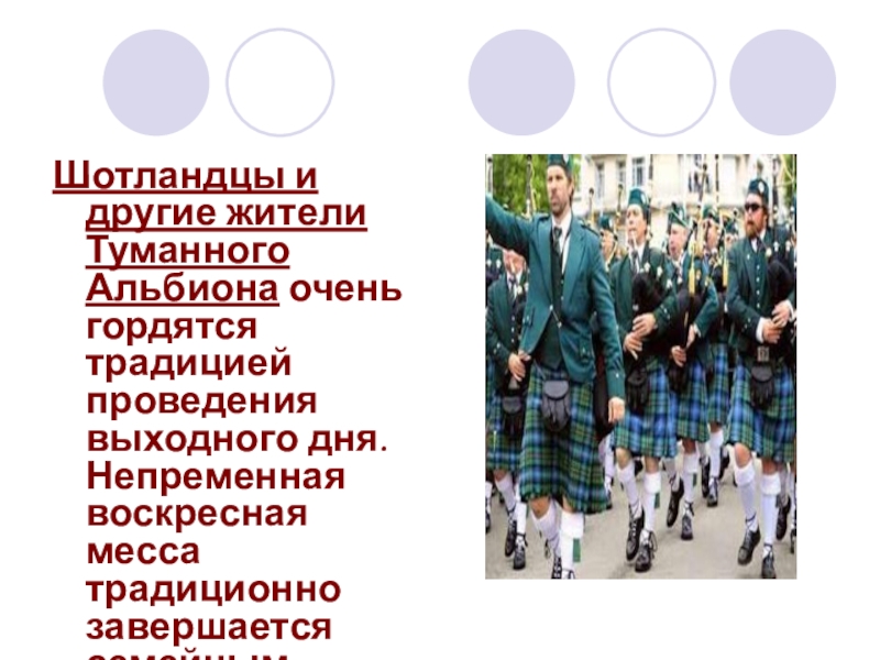 Слайд 17Шотландцы и другие жители Туманного Альбиона очень гордятся традицией проведения выходного