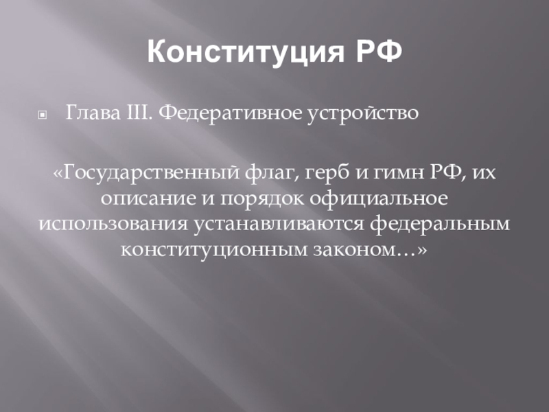 Конституция РФГлава III. Федеративное устройство«Государственный флаг, герб и гимн РФ, их описание и порядок официальное использования устанавливаются