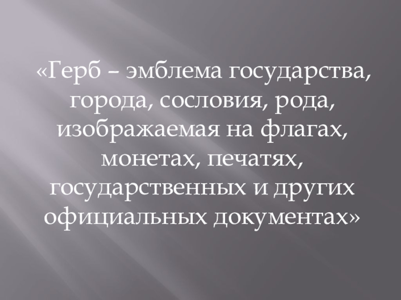 «Герб – эмблема государства, города, сословия, рода, изображаемая на флагах, монетах, печатях, государственных и других официальных документах»