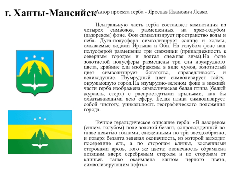 составляет композиция из четырех символов, размещенных на ярко-голубом (лазоревом) фоне. Фон символизирует пространство воды и неба. Дуга-полусфера символизирует солнце и холмы, омываемые водами Иртыша и Оби. На голубом фоне над полусферой размещены три снежинки (принадлежность к северным городам и долгая снежная зима).На фоне золотистой полусферы размещены три ели изумрудного цвета, крайние ели изображены в виде чумов, золотистый цвет символизирует богатство, справедливость и великодушие. Изумрудный цвет символизирует тайгу, окружающую город.На изумрудно-зеленом фоне в нижней части герба изображена символическая белая птица (белый журавль, стерх) с распростертыми крыльями, как бы охватывающими всю сферу. Белая птица символизирует собой чистоту, уникальность географического положения города.
